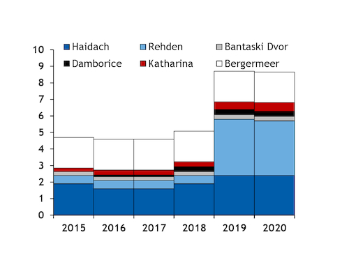 Gazpromexport built up its European storage space in recent years, including at the expense of its former subsidiaries, particularly at Rehden (see Gazpromexport capacity graph, other Gazprom capacity graph). The split in capacity was last published for the end of 2020.