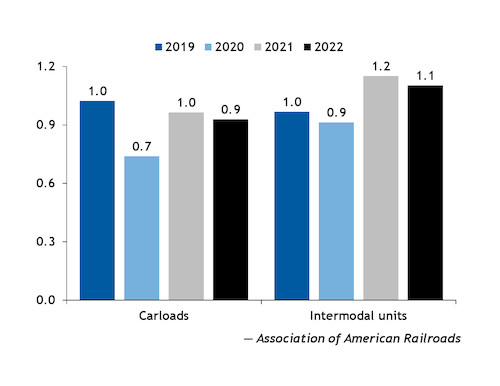Intermodal volume rose by 1.8pc in May from the prior month, but volume dropped by 4.3pc from May 2021.