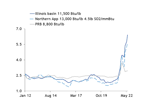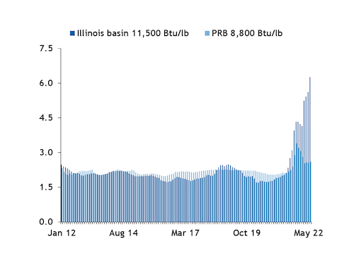 Premiums for Illinois basin and Appalachian coal over PRB coal are at historic levels, according to Argus data going back to September 2009. That reflects near record high prices for higher heat content coals. PRB prices are also elevated but have retreated from records reached in the autumn of 2021 as supply has loosened.