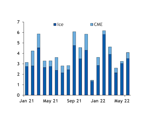 A total of 4.08mn t of API 4 volumes traded in June, with 3.51mn t transacting on Ice and 0.57mn t on CME. Combined volumes on both exchanges were up 13pc from a total of 3.61mn t in the same month a year earlier and up 26pc on the month from 3.24mn t in May.