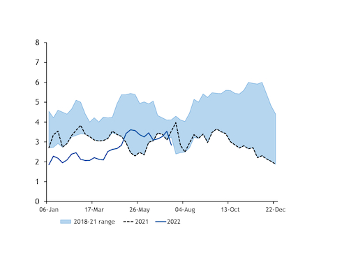 But stocks at the Richards Bay Coal Terminal totalled just 2.84mn t on 18 July, down 20pc from this time a year earlier and below the 2018-21 range (see chart).