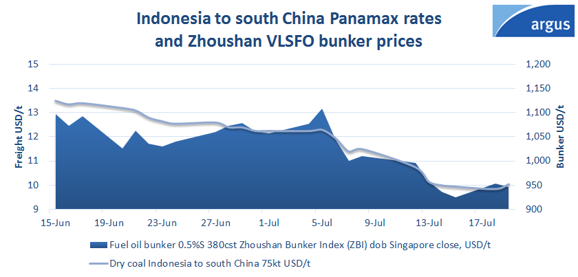 Panamax freight rates for the route had fallen by 27pc to $9.85/t on 18 July from $13.35/t on 15 June. Demand for low CV Indonesian coal was subdued earlier, as China's economic recovery had been slow. China's Covid-19 lockdown measures have eased, but the country's economic recovery was curbed by sporadic increases in Covid-19 cases. Initial summer demand was also curtailed by higher rainfall and typhoons.