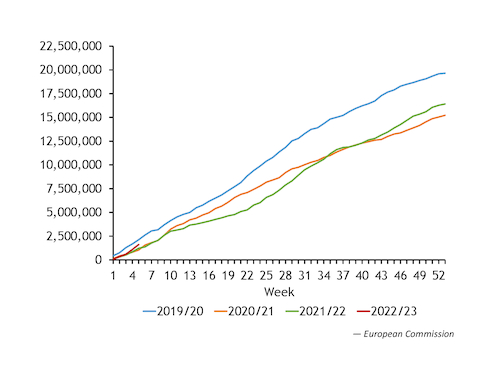 EU common wheat exports in the first five weeks of the 2022-23 marketing season reached 1.77mn t, ahead of last year's pace of 1.57mn t, which was driven by higher demand from the global market at a time of restricted supplies from Ukraine and Russia.