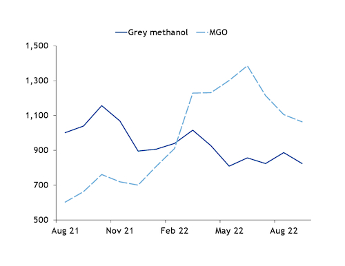 Methanol prices in the US Gulf coast dipped to a $529/t discount to MGO in July. The discount has since narrowed to $239/t in September but remains wide enough to draw interest, considering gasoil's price volatility.