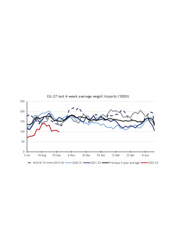 Imports of SBO dropped to an 11-week low in the week to 2 October, bringing cumulative imports since the beginning of the marketing year in July down by more than a third in the past two years. In contrast, soybean imports almost doubled on the week, indicating stronger margins for European crush plants despite medium-term concerns over energy costs.