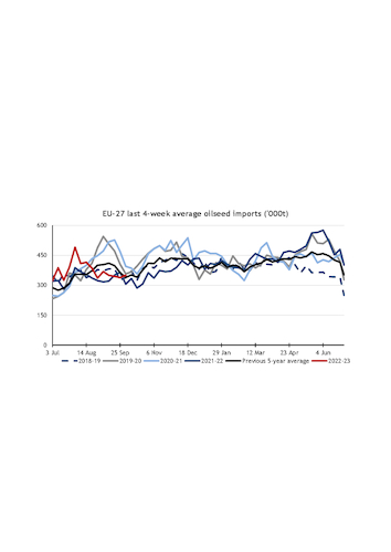 But rapeseed imports jumped to 181,000t on greater deliveries from Ukraine, representing by far the highest weekly volume so far this marketing year. Ukrainian rapeseed cargoes over the past four weeks were destined mainly for the Netherlands, with the country scheduled to receive 106,000t of product shipped last month.