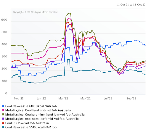 Argus last assessed the premium hard low-volatile coking coal price at $282.40/t fob Australia on 10 October, up from a recent high of $184/t on 2 August, but down from $525.25/t on 19 May.
