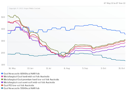 Argus last assessed high-grade 6,000 kcal/kg NAR thermal coal at $362.25/t fob Newcastle on 4 November, down from $411.87/t on 30 September and from a peak of $444.59/t fob on 9 September. It assessed the premium hard low-volatile metallurgical coal price at $320.80/t fob Australia on 4 November, up from $273.25/t on 5 October and from $203/t on 5 August but down from $664/t on 15 March.