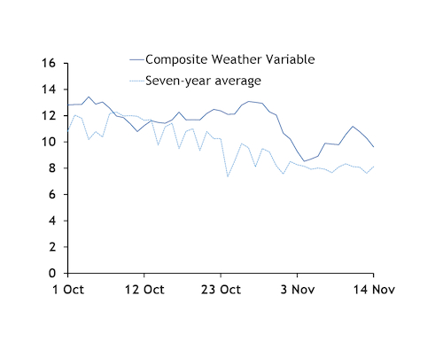 The weather has been unusually mild, pulling consumption below average. National Grid's composite weather variable (CWV), which factors in temperature and wind speeds to calculate an effective temperature, averaged 9.9°C on 1-14 November, up from 8°C over the period in 2015-21 (see CWV graph).