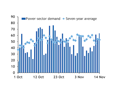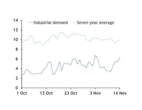 Industrial consumption of 4.8mn m³/d on 1-14 November is on track to be the lowest for any November since at least 2010. Demand from the sector has inched up from October when it fell to its lowest for any month since October 2010 (see industrial graph).