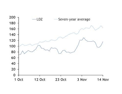 UK local distribution zone (LDZ) demand — which includes residential demand and most commercial and industrial consumption — was 113.6mn m³/d on 1-14 November, data from system operator National Grid show (see LDZ graph).