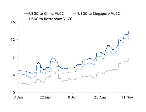 The freight rates on 14 November to ship WTI cargoes via Aframax and Suezmax from the US Gulf coast to Europe were $6.89/bl and $3.75/bl, respectively, compared with $3.37/bl for VLCCs.