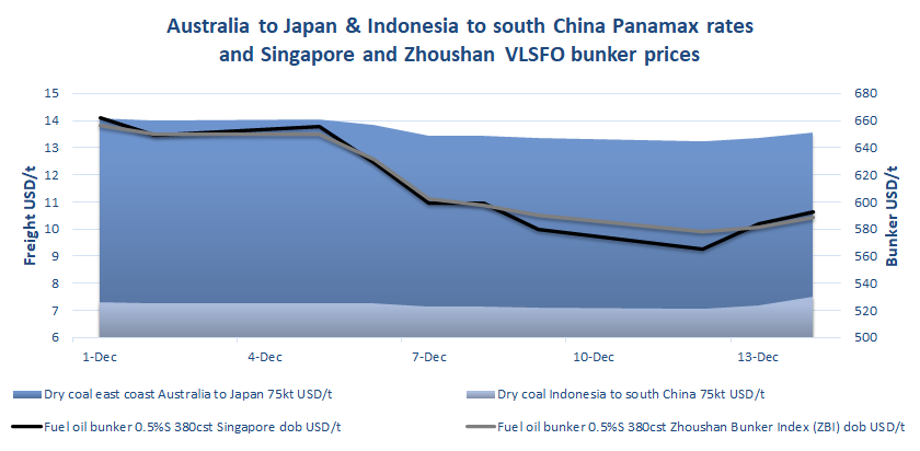 Australia-Japan/Indonesia/south China Panamax rates and Singapore/Zhoushan VLSFO bunker prices ($/t)
