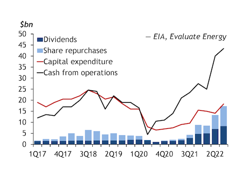 "Drill, baby, drill" is no longer the watchword of the shale industry. Since the pandemic, shareholders want a bigger share of profits and firms have throttled back upstream investment despite surging cash flow as oil prices recovered (see graph). Capital expenditure last quarter was only 42pc of cash from operations, while shareholders received 22pc as dividends. Firms also directed a further 21pc of cash generated to share repurchases and continued to pay down debt. Since the pandemic — when firms were forced to borrow to survive — debt-to-equity ratios fell from 96pc in the second quarter of 2020 to 47pc last quarter.