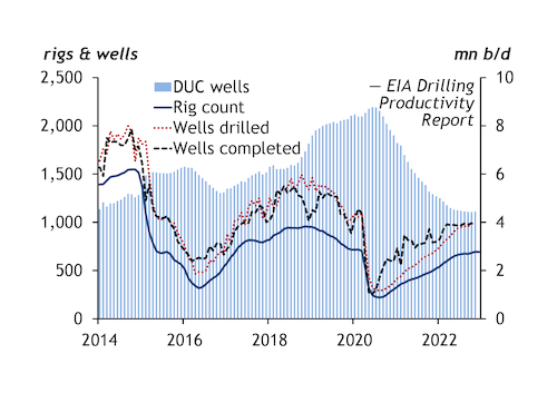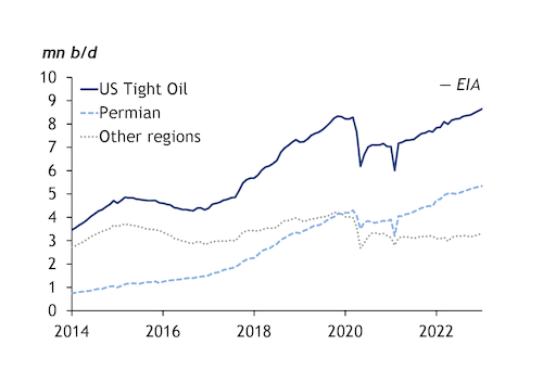 Switching objectives from output growth to rewarding shareholders has concentrated investment activity in the less mature, but much more prolific, Permian basin. Output remains below pre-pandemic levels in more mature shale producing regions — such as the Bakken and Eagle Ford formations — and growth has stalled. Operators in these regions are investing only enough to sustain output and keep the cash flowing. The Permian accounts for effectively all the 1.5mn b/d increase in US tight oil production since December 2020 — an average monthly growth rate of 1.3pc, compared with 2.8pc in 2017-19.