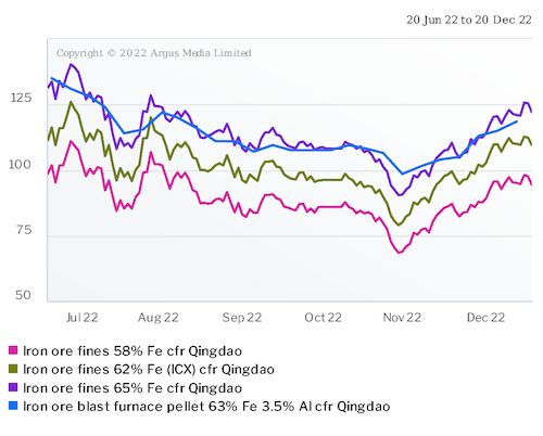 The OCE's 2022 average iron ore price forecast of $108/t is lower than the average ICX iron ore price for 62pc Fe ore that Argus assessed at around $120.27/t cfr China for the year to 20 December but above the $104.25/t for 58pc Fe. The average grade of Australian ore this year remains below 62pc Fe. Argus last assessed the ICX at $110.15/t cfr Qingdao on 20 December, down from a high for 2022 of $160.10/t on 1 April.