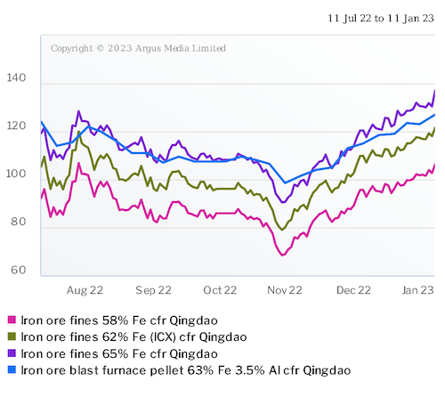 The Argus ICX iron ore was last assessed at $121.55/dry metric tonne (dmt) cfr Qingdao on a 62pc Fe basis on 10 January, up from $86.80/dmt on 7 November.