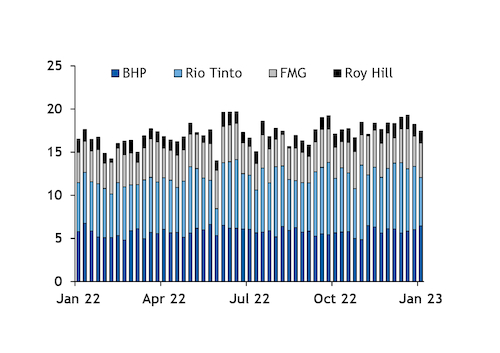 Shipments from the four largest iron ore producers in Western Australia's (WA) Pilbara eased in the week to 7 January after a strong end to 2022, as Rio Tinto's deliveries fell following the end of its financial year.