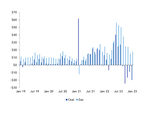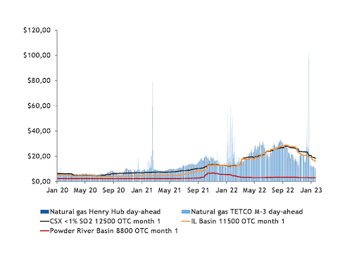 Coal prices have mostly declined so far this year. Prompt month CSX rail-originated coal with 12,500 Btu/lb and Powder River basin (PRB) 8,800 Btu/lb coal were assessed at $133/short ton and $15.45/st on 20 January, compared with $150/st and $15.60/st at the end of 2022. PRB coal also is lower than it had been in January 2022, which could support coal profitability in some regions. But CSX coal is still well-above where it had been a year ago, putting stress on coal generation dispatch margins in the eastern US.