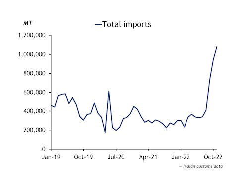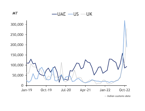 Shipments in January-November 2022 from India's top three suppliers, the UAE, US and UK, climbed by 13.4pc, 289.6pc and 182.8pc year on year to 1.16mn t, 787,977t and 660,922t in January-November.