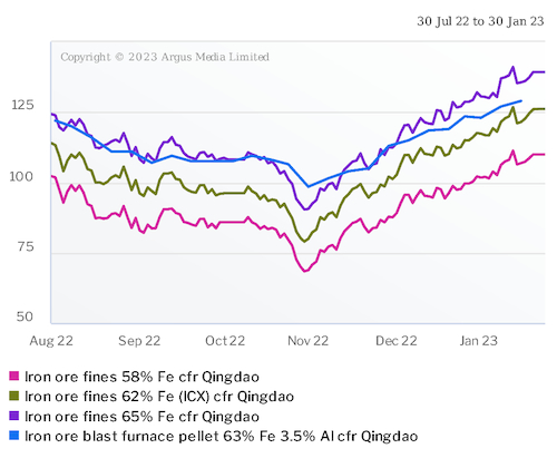 Argus last assessed the 65pc Fe iron ore price at $139.25/dry metric tonne (dmt) cfr Qingdao on 27 January, up from $101.20/dmt on 25 October, but down from $160.20/dmt on 1 June. It assessed the ICX iron ore price at $126.20/dmt cfr Qingdao on a 62pc Fe basis on 27 January, up from $89.70/dmt on 25 October, but down from $136.35/dmt on 1 June.