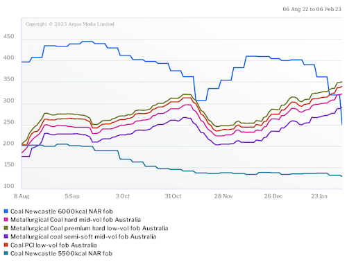 Argus assessed high-grade 6,000 kcal/kg NAR thermal coal at $249.79/t fob Newcastle on 3 February, down from $402.02/t on 6 January and from a peak of $444.59/t on 9 September. It assessed the premium hard low-volatile metallurgical coal price at $350.25/t fob Australia on 3 February, up from $314.75/t on 6 January and from $244.75/t on 24 November.