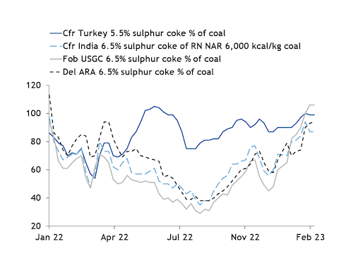 Delivered Amsterdam-Rotterdam-Antwerp (ARA) 6.5pc sulphur coke prices remained almost flat in January-February in the low-to-mid $150s/t, while coal prices were under pressure from lower consumption and high stocks during a warm winter in the region, as well as because of lower gas prices. The cif ARA coal daily index price fell by 36pc since the beginning of the year to a low point on 9 February of $119/t cfr — the lowest since 30 November 2021. It has since recovered but is still low in comparison with coke prices.