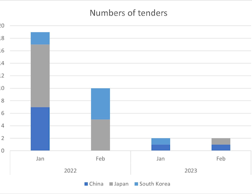 Prompt demand from Japan, China and South Korea continued to be weak, with the number of tenders issued over January-February this year being less than half the number during the same period in 2022.