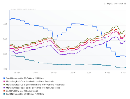 Argus last assessed high-grade 6,000 kcal/kg NAR thermal coal at $191.45/t fob Newcastle on 3 March, down from $249.79/t on 3 February and from a peak of $444.59/t on 9 September. It assessed lower grade 5,500 kcal/kg NAR coal at $116.98/t fob Newcastle on 3 March, down from $128.93/t on 3 February and from $137.53/t on 25 November.