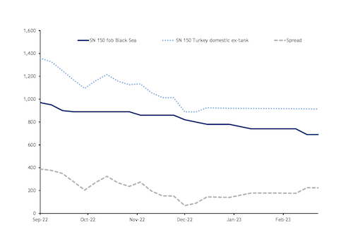 A widening spread (see chart) between Argus-assessed Group I SN 150 fob Black Sea prices and Group 1 SN 150 Turkey domestic ex-tank prices has meant Turkish blenders increasingly turning to Russian products. Imports from Russia more than doubled year on year to 120,000t in 2022.