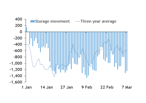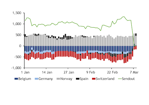 France imported pipeline supply via Belgium on 7-8 March for the first time since 10 July, while flows at the Pirineos interconnection point with Spain also reversed on Wednesday and pointed towards France for the first time since 11 February. And exports at the Obergailbach and Oltingue interconnection points with Germany and Switzerland fell sharply on 6-8 March (see supply graph).