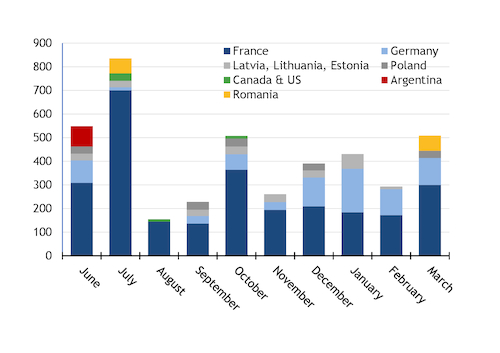 France kept its place as the top supplier with 300,000t arriving in Morocco in March, despite increasing competition from German sellers. German 11.5pc wheat was available fob Rostock at a similar price to fob Rouen levels for French 10.5pc wheat, with market participants indicating only a €1-2/t ($1.1-2.2/t) difference in freight between the two ports.