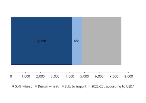 And with April-May imports capped at a total 1mn t, Morocco is set to fall short of its import needs for the current marketing year, as projected by the USDA (see chart). The country will then start the coming marketing year with lower beginning stocks, even after shifting suppliers in 2022-23 to make up for a near-total lack of Ukrainian and Argentinian supply.