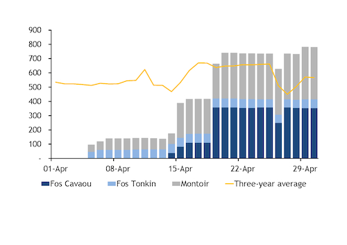 Combined sendout from the three Elengy-operated terminals was expected to average 363 GWh/d on 14-18 April — from 309 GWh/d previously — before climbing to 729 GWh/d for the remainder of this month (see graph).