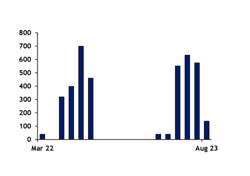 Enarsa has bought 1.97mn t of LNG across 44 LNG cargoes for delivery across March-August so far this year compared with about 850,000t in 18 cargoes for delivery in March-July 2022 by late April last year, Enarsa data show. The firm has bought 32 partial cargoes for delivery to its Escobar import terminal — about a 70pc share of all purchased supply — and 12 standard-sized cargoes for Bahia Blanca compared with 11 cargoes for Escobar by this time last year and seven for Bahia Blanca. Argentina has already bought slightly more LNG for this year than all of the supply secured for last year, when Enarsa continued to tender for cargoes through to June.