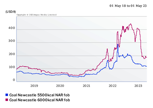 Argus last assessed high-grade 6,000 kcal/kg NAR thermal coal at $184.98/t fob Newcastle on 28 April, up from $178.99/t on 31 March but down from $195.53/t on 24 February and from a peak of $444.59/t fob on 9 September 2022. It assessed low-grade 5,500 kcal/kg NAR thermal coal at $117.03/t fob Newcastle on 28 April, down from $120.68/t on 31 March and from $118.99/t on 24 February and $199.12/t fob on 9 September 2022.