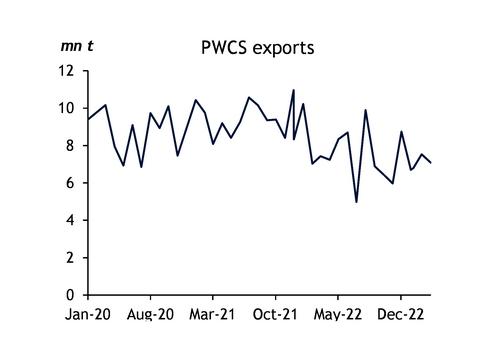 Deliveries to Newcastle were disrupted by a major network-wide shutdown over 4-6 April with another scheduled for 23-25 May. PWCS stocks grew to 1.42mn t from 1.4mn t at the end of March. The other terminal operator NCIG does not release monthly data.