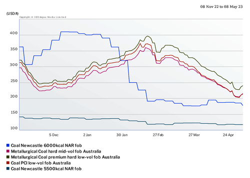Argus assessed high-grade 6,000 kcal/kg NAR thermal coal at $177.04/t fob Newcastle on 5 May, down from $319.23/t on 27 January and from a peak of $444.59/t on 9 September 2022. Argus assessed the premium hard low-volatile metallurgical coal price at $246.40/t fob Australia on 10 May, down from $367.55/t on 3 March.