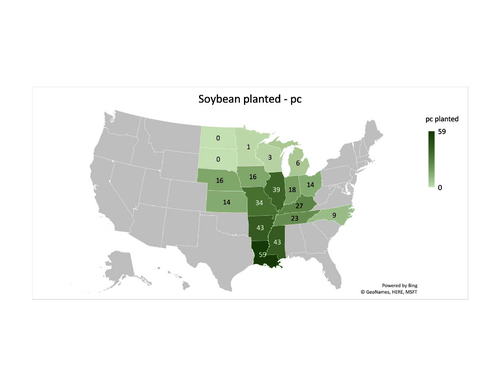 Soybean planting continues at a brisk pace with 49pc of the crop already planted for the week ending 14 of May as compared with the five-year average of 36pc. All 18 states are ahead of their five-year average except for North Dakota, Wisconsin, and Minnesota. Weather has also slowed the soybean planting progress with North Dakota having planted 2pc of the soybean crop for the week ending 14 of May as compared with the five-year average of 15pc, Wisconsin planted 24pc as compared with the five-year average of 30pc and Minnesota has planted 30pc versus the five-year average of 37pc.