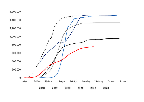 That said, the latest ministry data on spring crop planting progress showed that only about 760,000ha were sowed with spring barley on 18 May (see chart), with the planting delayed significantly by rainy weather in April. The planting campaign for spring barley is almost finished in most regions, with only about a 20,000ha week-on-week increase registered in the two weeks to 18 May.