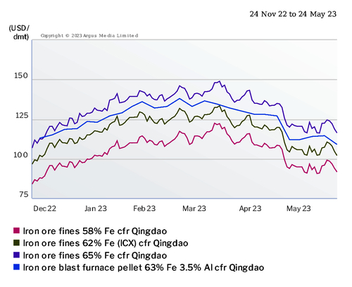 TheArgus ICX iron ore index was last assessed at $102/dry metric tonne (dmt) cfr Qingdao on a 62pc Fe basis on 23 May, down from a high of $133.40/dmt on 15 March but up from a low of $79/dmt on 31 October 2022.
