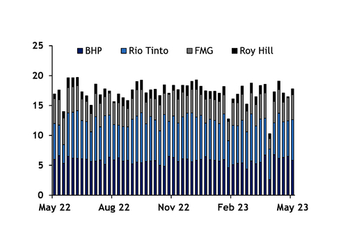 Total shipments were 3pc above average, with BHP and Rio Tinto close to average and Fortescue rising to 11pc above average, offsetting lower throughput by Roy Hill.