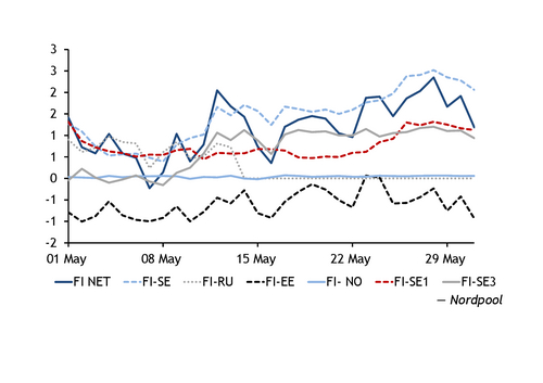 Finnish net border power flows averaged 600MW in May, up from net imports of 1.19GW a year earlier, with the country registering a 151pc increase year on year.