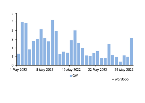 Finland's power capacity flexibility has been further assisted by improved hydropower reserves in the region, with Finnish hydro stocks reaching 3.86TWh in week 21, up by 6pc on the week and up from 1.92TWh at the end of April. Finnish hydro run-of-river generation provided a significant proportion of the country's generation mix in May. It provided more than 2GW for several days during the month, peaking at 2.49GW on 12 May.
