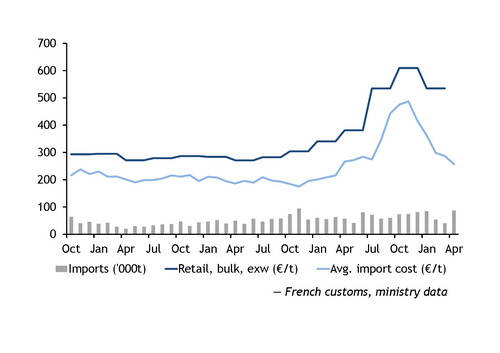 On imports, French companies diversified their sourcing country portfolio to make up for sanctioned Russian supply in the 2022-23 winter. Overall imports rose by just 7,000t year on year to 408,000t during the period, with most of the increase seen in the fourth quarter, with imports broadly unchanged in January-March 2023.
