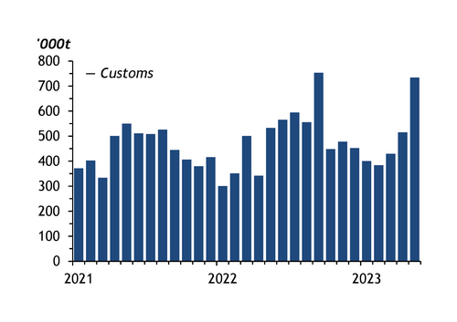 Arrivals of butane rose by 43pc on the month and 38pc on the year to 734,200t in May, the second highest on record after the 753,300t intake in September 2022, customs data show. This put the country's imports at 2.46mn t in the first five months of 2023, more than a fifth higher than a year earlier. In China, imported butane is mainly used as a fuel, for gasoline blending and as a petrochemical feedstock. By province, Zhejiang and Shanghai provinces contributed 45pc of the total 219,300t month-on-month increase in butane imports, Guangxi 23pc, Shandong 19pc and Liaoning 10pc.