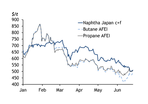 The butane Argus Far East Index (AFEI), for large cargoes on a Japan-delivery basis, averaged around $580/t, $513/t and $460/t in April, May and June, respectively. This was about $4/t, $9/t and $33/t lower than the propane AFEI, and $93/t, $79/t, and $79/t lower than the naphtha cfr Japan assessment, respectively. Lower butane prices attracted some crackers and domestic distributors to increase their purchases, with rising arrivals at wholesale terminals in Guangxi and to Bora-LyondellBasell's 1.1mn t/yr ethylene cracker in Liaoning.