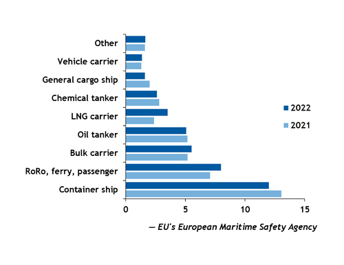 Bunker demand from container ships and oil tankers dropped. Container ships accounted the bulk of EU's bunker demand — 29pc, or 12mn t of EU territorial waters bunker demand in 2022. Their consumption declined by 8pc and they emitted 37.19mn t of CO2. Oil tankers' demand was down by 2pc to 5.07mn t.