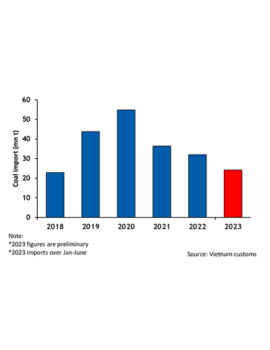 Coal imports rose to around 24.2mn t in January-June, according to provisional customs data, up from 16.65mn t for the same period a year earlier. Vietnamese customs data do not differentiate between coking and thermal coal. Higher coal-fired generation has supported the outlook for thermal coal imports. Monthly coal imports have averaged around 4mn t after a surge in Vietnam's intake in June. If the country continues to import at this rate, its seaborne receipts could rise to 48mn t this year, up from 32mn t in 2022. Its imports hit an all-time high of around 55mn t in 2020, as buying interest was supported by drop in international coal prices following the Covid-19 pandemic.