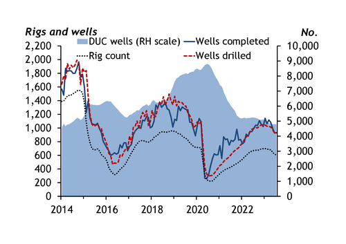 Others argue that improved performance does little to buck the long-term trend and measures to drill longer laterals, improve well designs and speed up drilling times will only delay the inevitable. Given that output from new shale wells falls rapidly after initial production, firms must continuously drill just to maintain volumes. But productivity gains signal no change in strategy, with some publicly-listed companies only marginally raising output forecasts as they remain wedded to a guiding principle of fiscal restraint to prioritise shareholder returns.